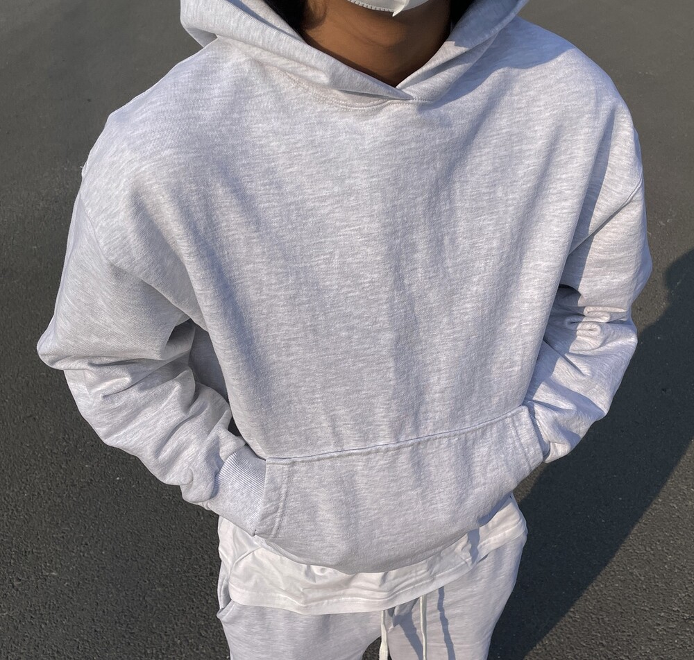 넓은 품, 크롭한 기장이 특징인 형태의 후드티 입니다.