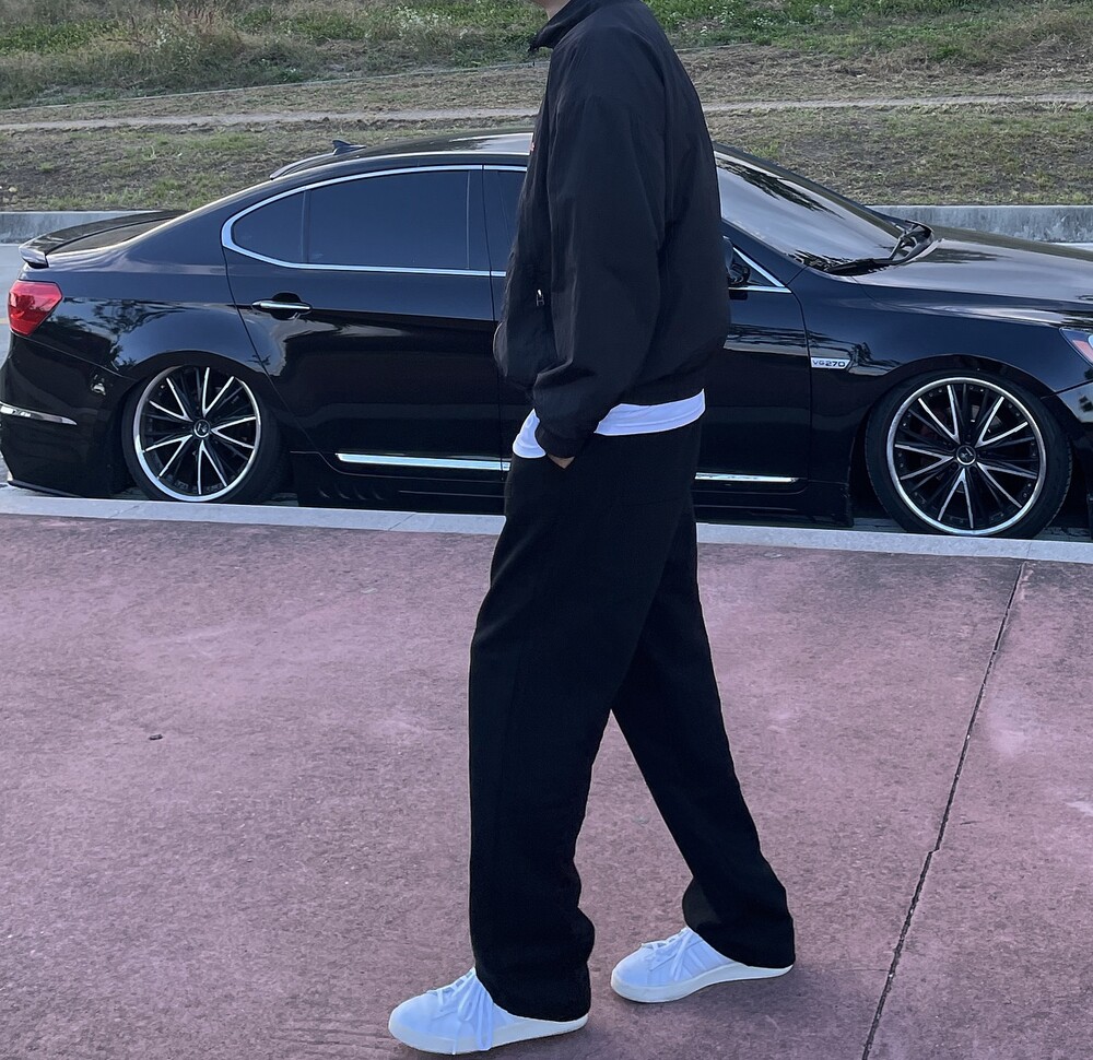 M, L사이즈 차이는 기장차이만 있으며, 와이드한 핏으로 나온 만큼 M사이즈도 긴 기장으로 제작됐습니다.